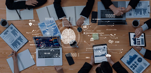 Aerial view of a team engaged in a collaborative meeting on enterprise resource planning, featuring charts and visual strategies for efficient business operations and management. Amity