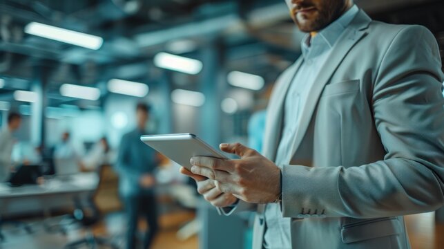 A professional analyzing data on a digital tablet in a modern office. The background includes colleagues and office equipment, creating a collaborative work atmosphere.