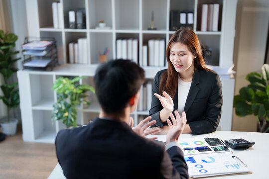 Asian business professionals engaging in a collaborative discussion in a modern office, analyzing financial charts and reports on a desk during a meeting