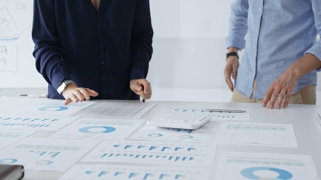 Business colleagues are examining financial data, pointing at charts and graphs spread out on a table during a collaborative analysis session in a modern office.