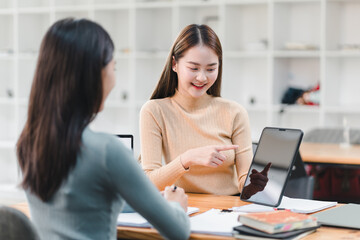 woman in beige sweater is smiling and pointing at tablet while sitting at table with another woman. setting is modern workspace with books and papers around, creating collaborative atmosphere.