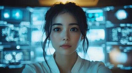 Businesswoman engaging with digital tablet in modern office environment