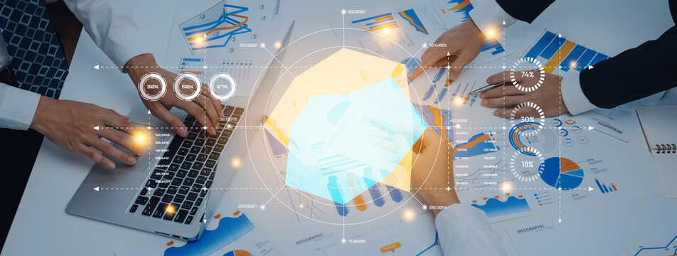 Collaborative team analyzing data on laptop with overlay graphics
