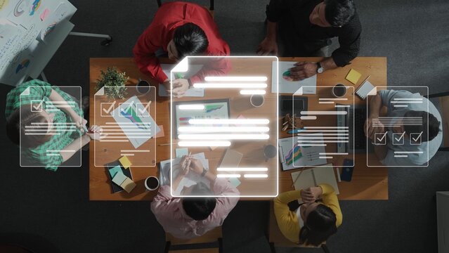 A group of diverse business professionals engaging in a collaborative meeting, analyzing charts and documents on a table in a vibrant office atmosphere. SACTR