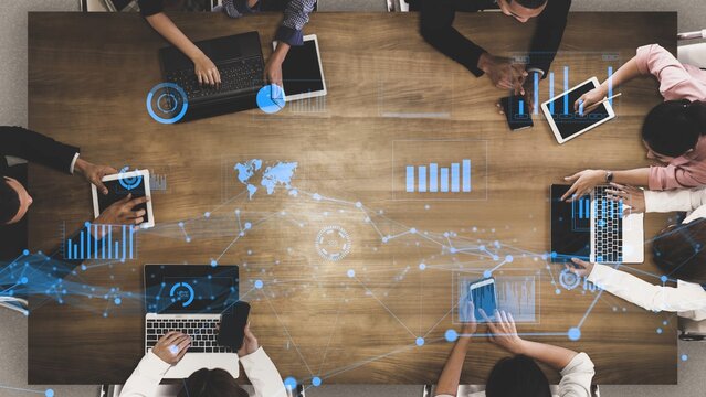 Business professionals engage in collaborative work at a conference table, analyzing digital data and financial reports on a modern workspace for strategic planning. Trope