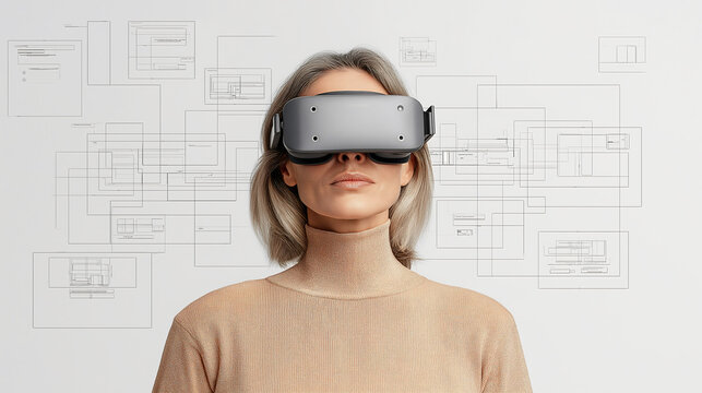The augmented reality architect tests user interaction maps and floating wireframes in a minimalist design studio marked with bold geometric patterns and spatial computing elements