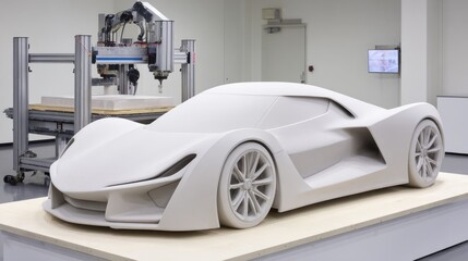 Sculptural Design of a Modern Sports Car Prototype in a Cutting-Edge Workshop Environment