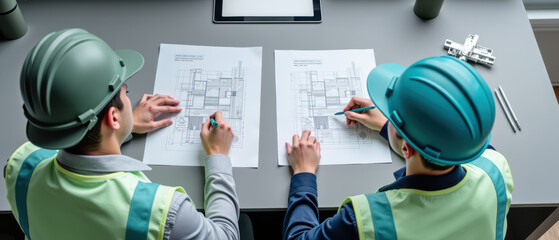 Collaborative architects reviewing blueprints, wearing safety helmets and vests, focused on detailed plans, showcasing teamwork and design