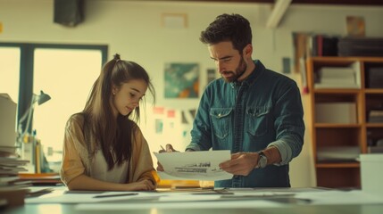 Collaborative Design: Two Professionals Reviewing Plans and Working Together in a Modern Office Space