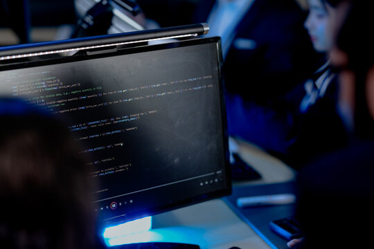 Deep code focus. Developers working late debugging software script visible on screen collaborative coding session in progress intense tech teamwork dev life revealed.