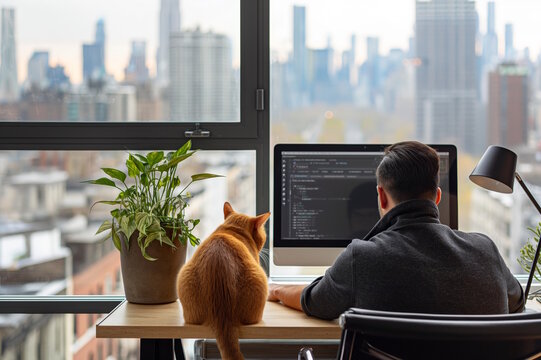 Young Asian man working on computer with cat, concept of productivity and companionship