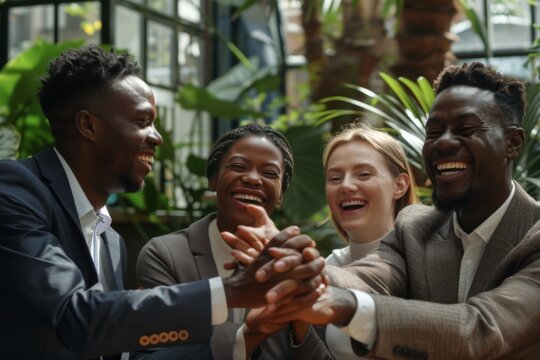 Collaborative Team Meeting With Diverse Colleagues Laughing, Shaking Hands, and Sharing Ideas in Office