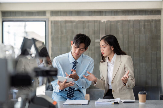Young professional teamwork meeting discussing business chart and digital report with pen and notebook on office desk, collaborative planning and focused analysis
