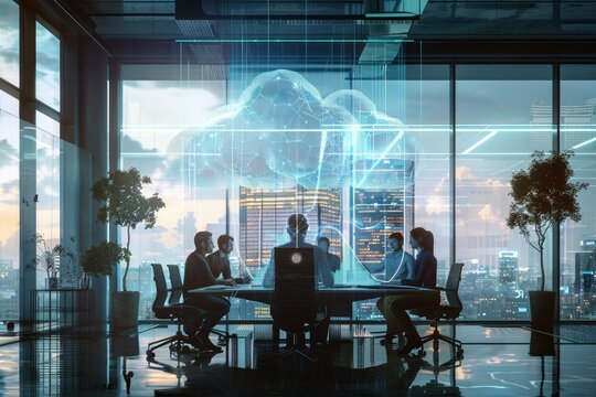 A group of architects in a modern office with an AI assistant as luminous data streams, projecting holographic building models. Cityscape view in background. AIG60