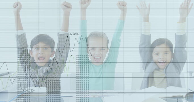 Image of financial data processing over portrait of happy schoolchildren cheering with arms in the a