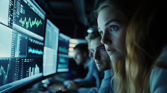 A group of analysts focuses intently on large screens, analyzing data trends and statistics during a collaborative session in a modern workspace