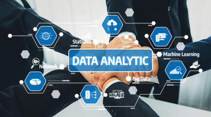 Team members unite in a modern office, showcasing hands in a collaborative effort while visualizing data analytic concepts for strategic decision making and business growth. Amity