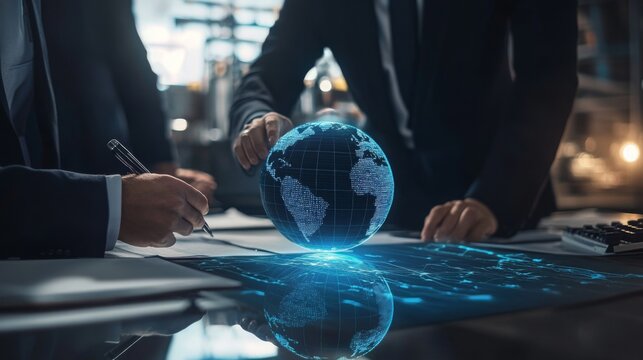 Professionals engage in collaborative discussions about ai advancements and sustainable finance strategies at a contemporary office. The focus is on a glowing digital globe symbolizing global impact.