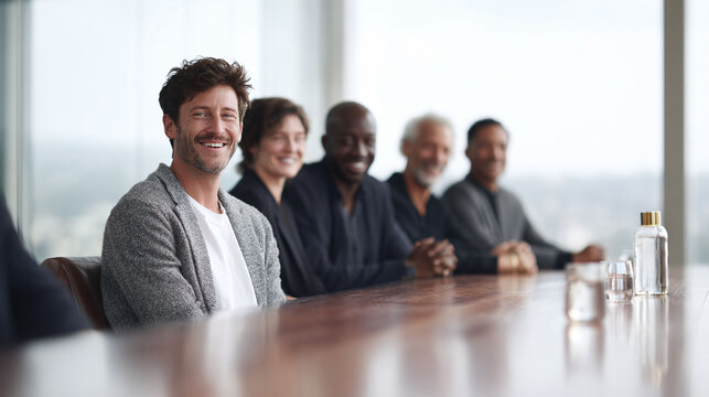 Diverse business team at modern conference table. Success, leadership, and inclusion represented by smiling professionals in a bright, collaborative workspace.