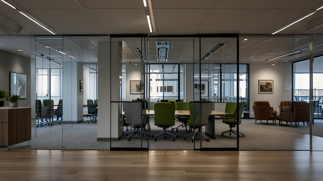 Open-plan layout with collaborative workspaces, glass-walled meeting rooms, and private offices.