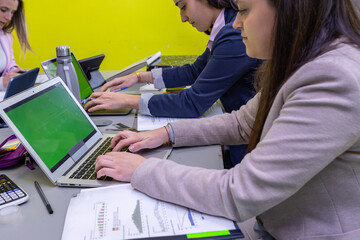Vibrant Team Collaboration: Three diverse young professionals working together on laptops, showcasing a lively and collaborative work environment.