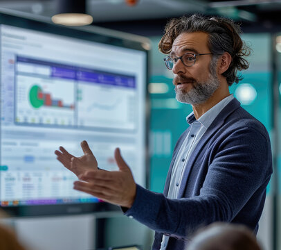 A collaborative office setting where employees engage in a training session. A facilitator points to a screen displaying a digital learning platform with courses and skill assessments.