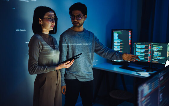 Asian Two software developers engaged in collaborative coding session, with code projected onto the wall and multiple computer screens displaying