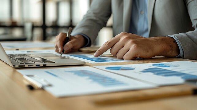 Collaborative teamwork in a modern office setting, hands of business professionals analyzing financial documents and reviewing reports during a strategy meeting.