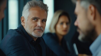 Meeting of Minds: A collaborative discussion unfolds in a modern office space, capturing a moment of business interaction and thoughtful deliberation.