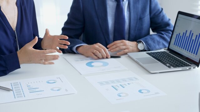 Business people reviewing financial data, discussing and shared documents during collaborative strategy session. Audit and finance concept
