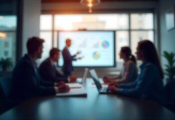 Diverse team of professionals engages in a productive meeting, utilizing laptops for data analysis and collaborative discussion in a vibrant, modern office environment