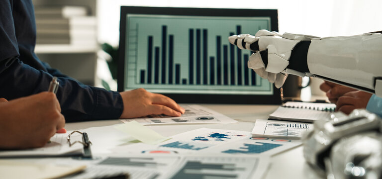 A human and robotic hand interact in a collaborative business environment, analyzing data charts on screens while enhancing decision-making in modern workplaces.Noogenesis