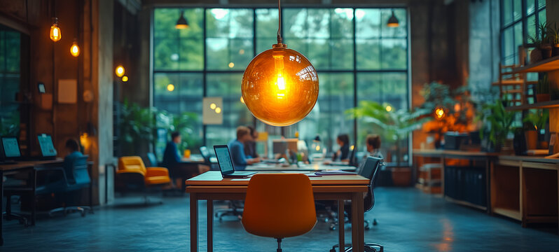 Modern office interior with warm lighting and collaborative workspace