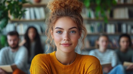 Professional woman smiling confidently in a modern office workspace with a collaborative atmosphere