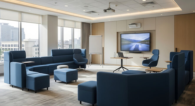 Modern office lounge area with blue seating, large windows, and presentation equipment for collaborative work ai generated