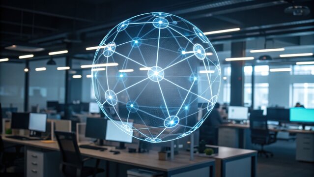 A modern office space with digital network graphics, representing connectivity and technology in a collaborative work environment.