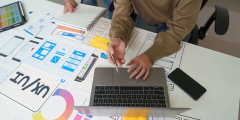 Team Collaboration on UX UI Design with Laptop and Sketches