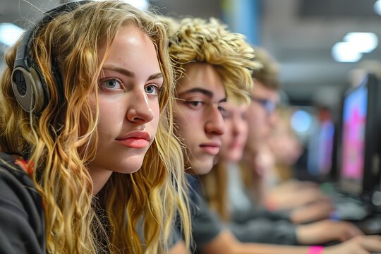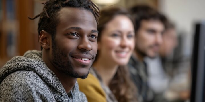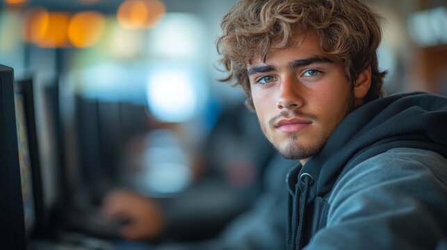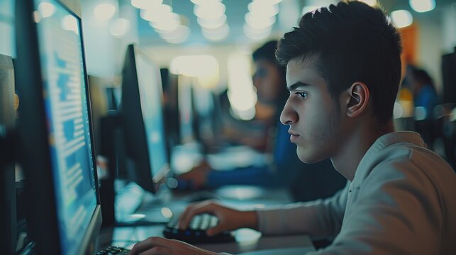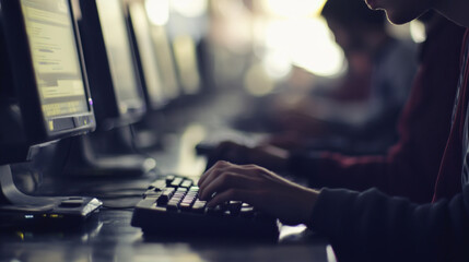 Blurred focus of university students studying in computer lab with selective focus on serious student working on computer – group study environment in modern educational setting