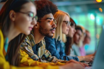 Group of diverse students focused on laptops, engaged in computer lab class or online learning session.