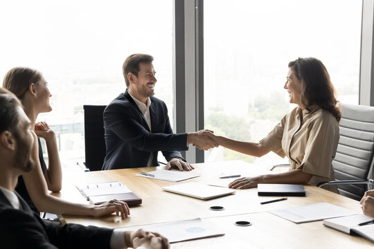 Group of businesspeople sit at conference table, shaking hands, sign of successful negotiation conclusion, reached agreement, formal acceptance of deal, start beginning of collaborative partnership