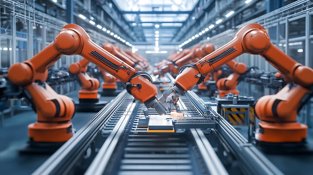 A robotics expert programming collaborative robots for assembly line tasks, manufacturing plant with robots and conveyor belts visible, High-tech style