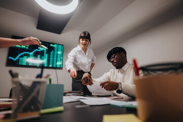 Business team engages in collaborative discussion with data analysis and charts in modern office setting