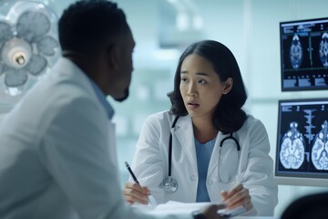 Asian woman in a café discussing and analyzing a report with a colleague. She looks concerned while holding a document with charts. The setting is modern and cozy, fostering a collaborative atmosphere