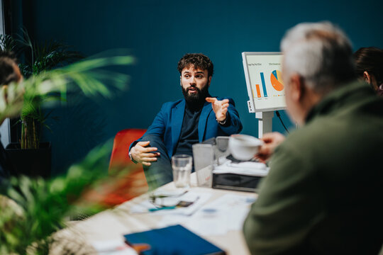 Professional Consultant Engaging in a Strategic Business Meeting with Data Visualization Tools and Collaborative Team Environment in a Modern Office Setting