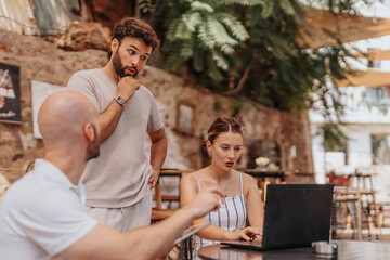 A collaborative team of experts strategizes for e-commerce success in a cafe bar, analyzing data, discussing trends, and working on new projects.