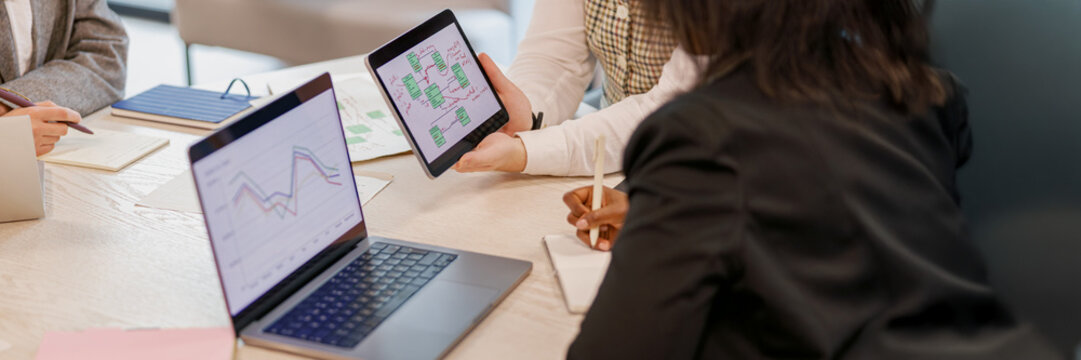 A group of professionals engage in a collaborative business meeting, analyzing data and developing strategies using laptops and documents on a bright office table. SACTR