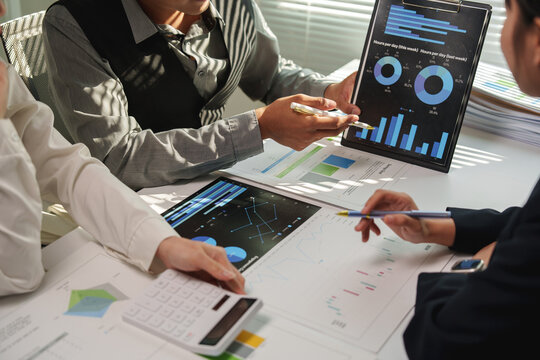 Business team analyzing financial charts and statistics displayed on a digital tablet and printed documents, using a calculator for precise calculations during a collaborative meeting in the office