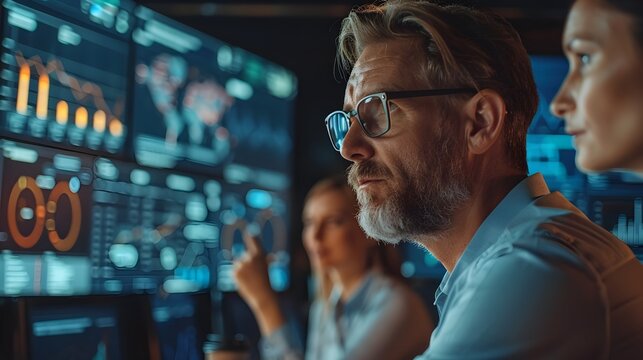 Over-the-shoulder view of an analyst pointing at a vibrant 3D chart on a large monitor, with detailed graphs displayed on additional screens in a tech workspace