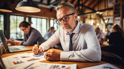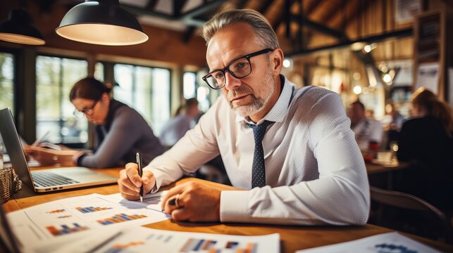 A collaborative team of professionals meticulously reviewing financial data, strategizing over important business decisions in a modern, well-lit office setting.