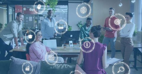 Seven-person team brainstorming and collaborating in modern open office with technology icon overlay